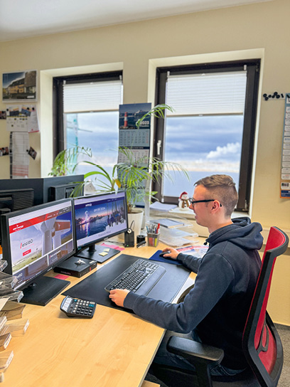 Our trainee Tim Sturm at his workplace in the Speicher building.